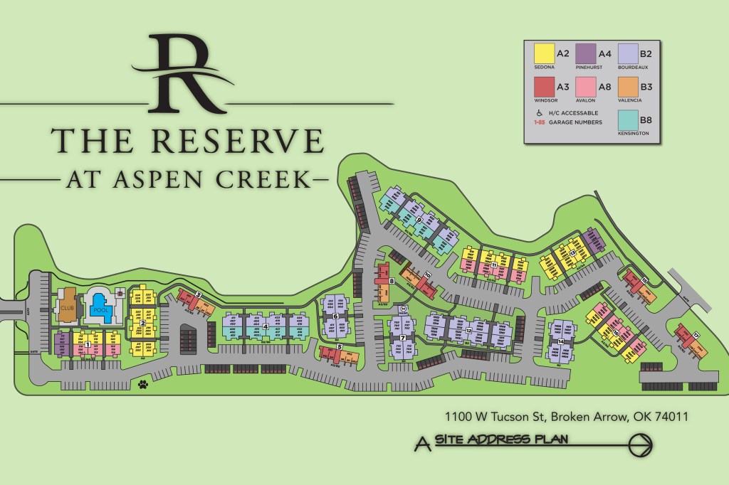 The Reserve at Aspen Creek Property Map was created by scanning and viewing floor plans. The color codes are based on floor plan. Each room and carport are numbered appropriately. The map was customized to the request of the manager.