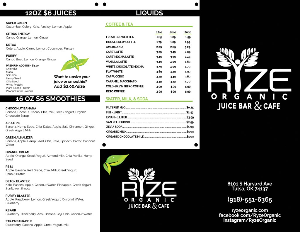Drawing inspiration from Ryze Organic Juice Bar’s drive thru board, I created the take out menu. This menu is a tri-fold.