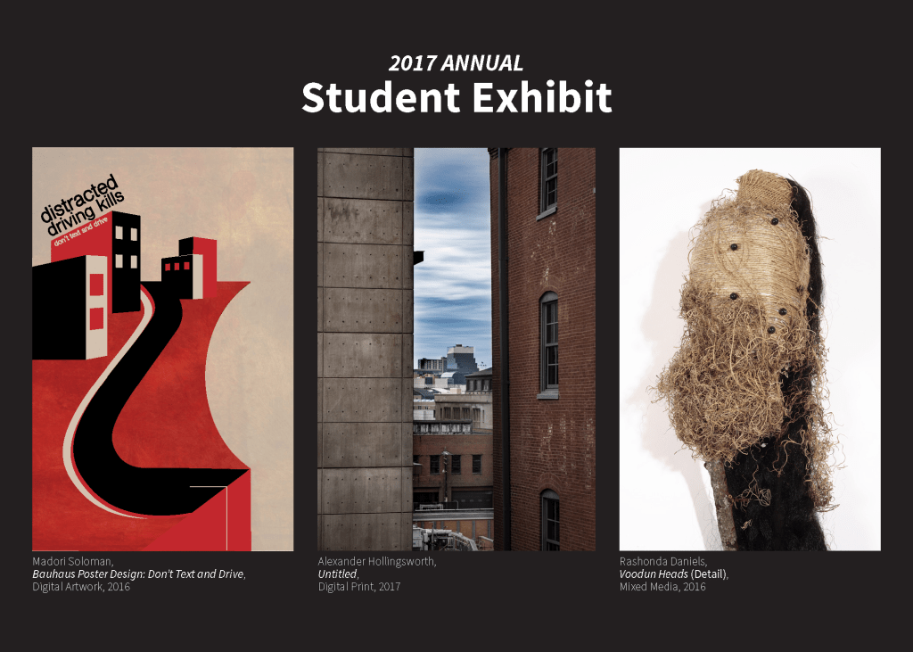 The 2017 Annual Student Exhibition postcard displays three images from students with work in the gallery show. The back of the postcard features easy to read text which provides the viewer with the information about the show.